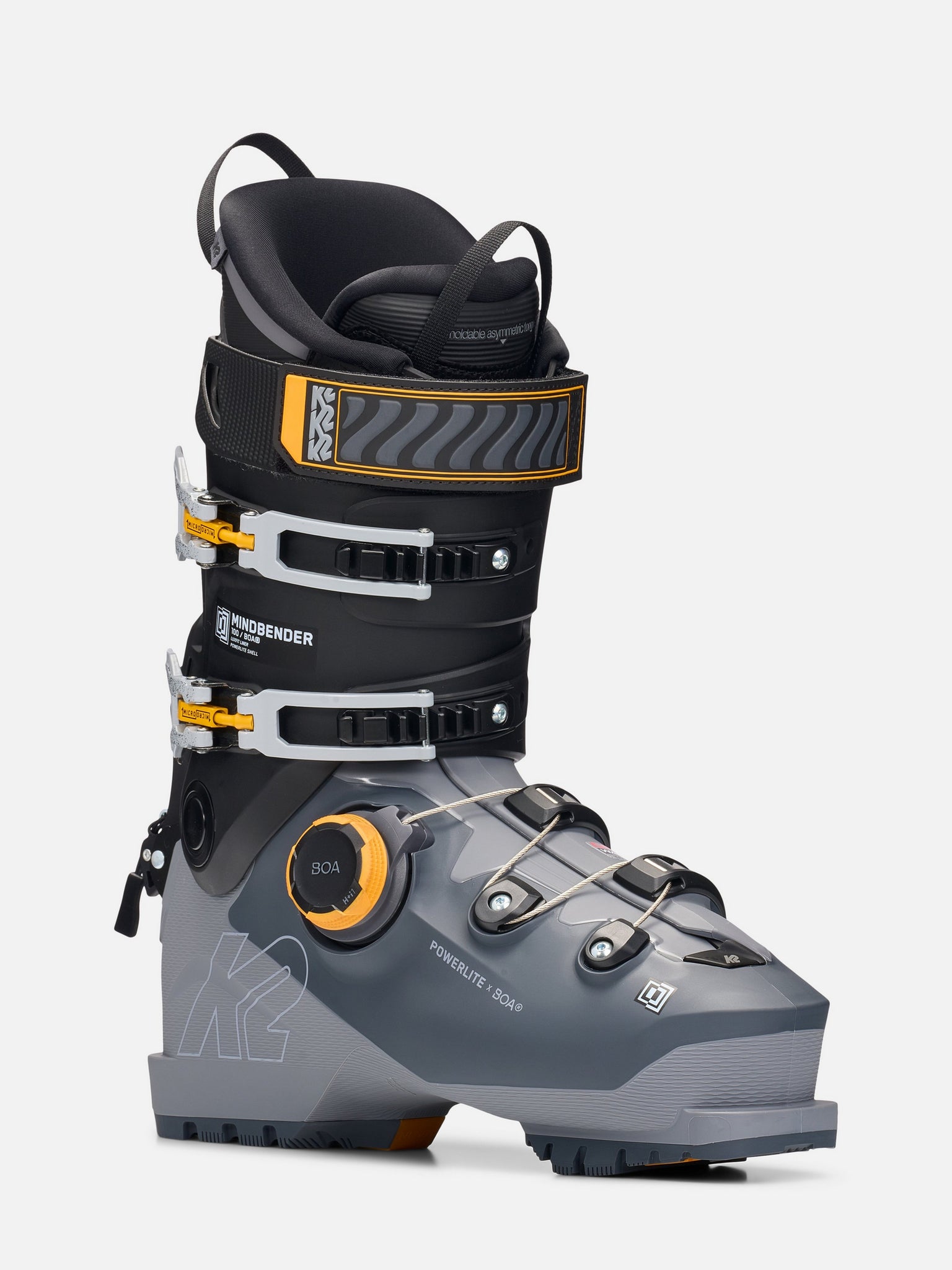 The K2 Mindbender 100 BOA® men’s ski boot is a versatile, medium-volume option designed for intermediate skiers looking to explore both resort and backcountry terrain. Featuring K2's lightweight Powerlite Shell and a 100mm last, it balances durability, responsiveness, and comfort, with heat-moldable capabilities for a custom fit. Equipped with the BOA® Fit System for a precise, micro-adjustable fit and the Powerlock Spyne walk mode with a 50-degree range of motion, it ensures efficient uphill movement without sacrificing downhill control.